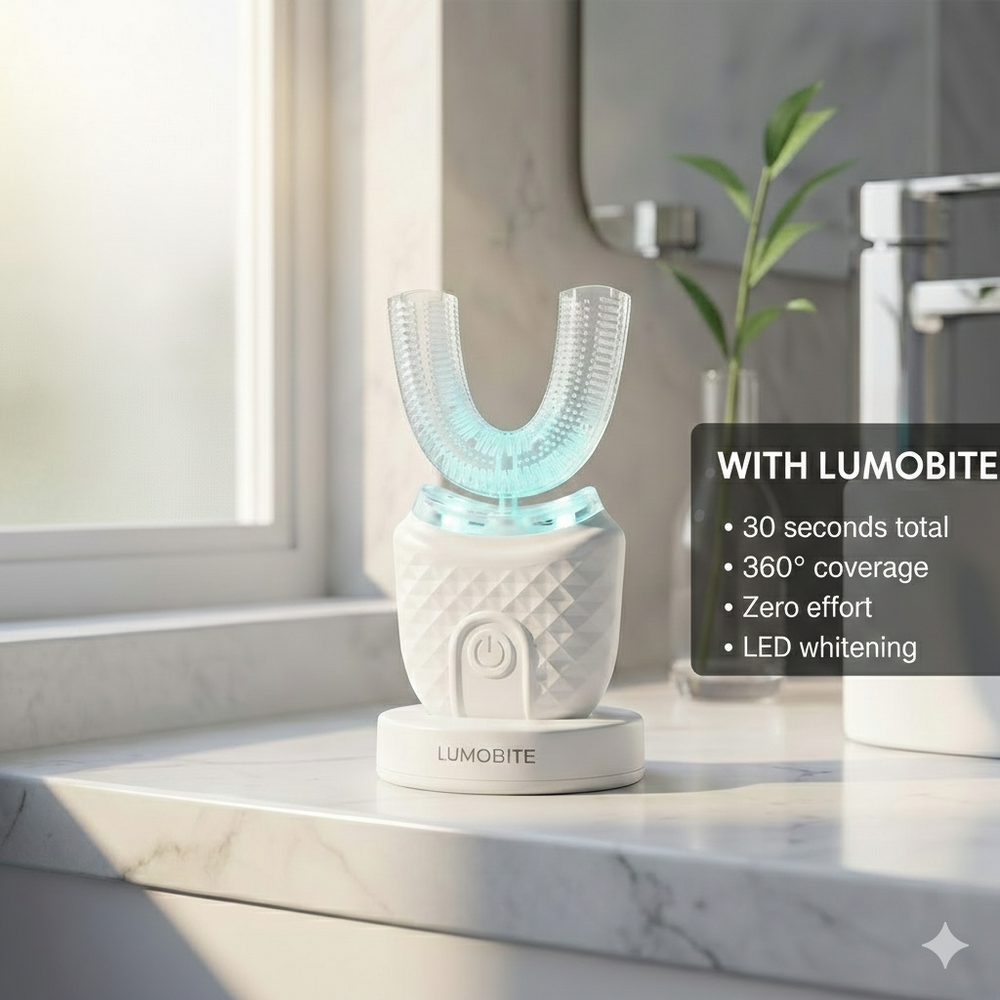 Lumobite's revolutionary U-shaped design surrounds every tooth simultaneously, delivering 18,000 sonic vibrations per minute to all surfaces at once. What takes 2+ minutes with a traditional brush takes just 30 seconds with Lumobite—and the results are superior.